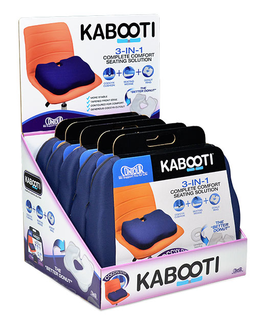 This eye-catching P.O.S. display effectively merchandises 5 Kabooti Seat Cushions.